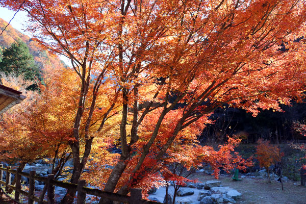 道路から見えた綺麗な紅葉は坂道の方。